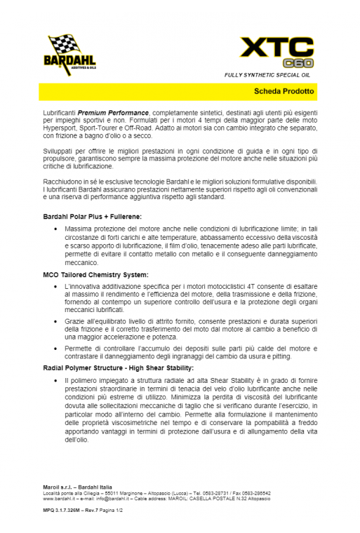 MCO Tailored Chemistry - sviluppato su misura per applicazioni motociclistiche e addizionato con Bardahl Polar Plus + Fullerene C60