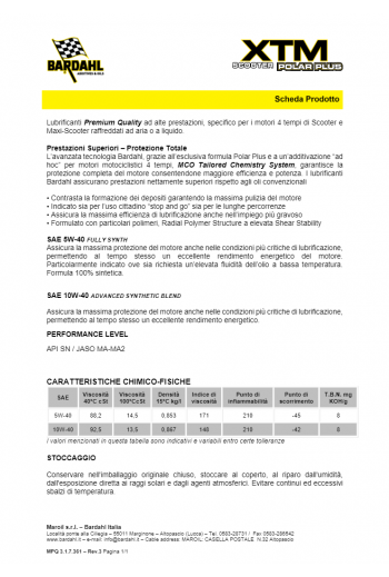 OLIO MOTO 4T XTM POLAR PLUS SCOOTER 10W40 SPECIFICHE TECNICHE: API SN / JASO MA-MA2 SAE 10W-40