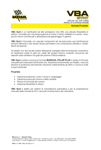 Proprietà e tecnologia della gamma VBA La formula Bardahl Polar Plus garantisce la massima sicurezza anti-grippaggio anche nelle più difficili condizioni d’impiego del motore. Essa forma una pellicola molecolare lubrificante che, fissandosi chimicamente sul metallo, crea una barriera di protezione permanente riducendo drasticamente gli attriti su tutte le parti del motore.