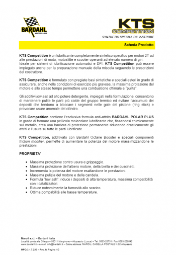 Proprietà e tecnologia di KTS COMPETITION La formula BARDAHL POLAR PLUS garantisce una maggiore potenza con la massima sicurezza anti-grippaggio anche nelle più difficili condizioni d'impiego del motore.